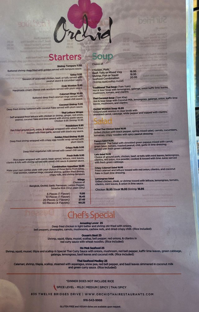 Orchid Thai Cuisine in Lincoln, CA, offers a wide array of Thai dishes with options for vegans and vegetarians. The restaurant provides a casual dining experience with outdoor seating, along with happy hour specials and a full bar. Customers praise the flavorful food, prompt service, and beautiful decor of the restaurant. Standout dishes include the red curry, drunken noodles, spring rolls, and coconut shrimp. While some customers have noted issues with the ripeness of certain ingredients, overall, Orchid Thai Cuisine remains a popular choice for Thai food enthusiasts and casual diners alike. The menu features a variety of Thai classics and unique creations, making it a must-visit spot for those looking to explore the flavors of Thailand.
